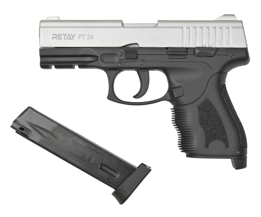 Охолощенный СХП пистолет Retay PT24 (Taurus) 9mm – это лишенная возможности стрелять боевыми патронами модификация от известного турецкого производителя, разработанная на основе бразильского самозарядного пистолета. Эта модель предназначена под свето-шумовые патроны калибра 9 мм (PA, P.A.K), которыми снаряжается 14-зарядный магазин. Выстрел сопровождается сильным, мощным звуком. УСМ пистолета Retay PT24 (Taurus) одиночного действия, стреляет в полуавтоматическом режиме. В модели реализована функция Blowback, повышающая реалистичность выстрела. Использование боевых патронов невозможно за счет заглушки в стволе. Установлен неавтоматический предохранитель.