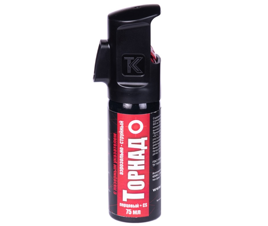 Средство самообороны «Торнадо» объемом 75 мл выпускаются со струйным и аэрозольно-струйным типом распыления. Отличительной особенностью «Торнадо» является наличие лазерного целеуказателя, что обеспечивает точное попадание аэрозольной струи в цель, а также интенсивный выброс содержимого. При легком нажатии на кнопку — срабатывает лазер. При полном нажатии — происходит выброс содержимого.