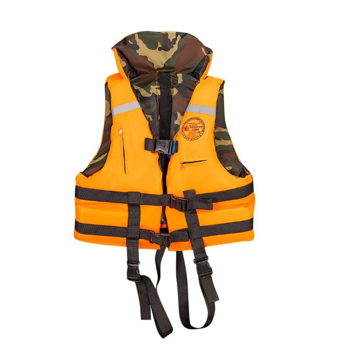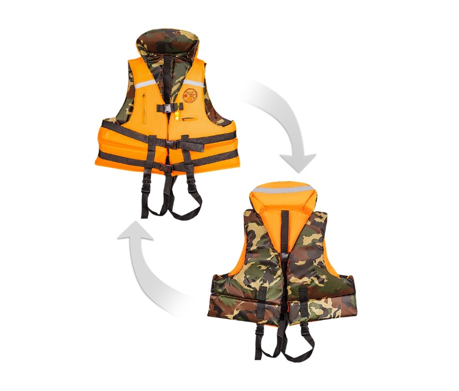 Спасательный двухсторонний жилет используется для обеспечения безопасности на воде во время рыбалки, тренировок, соревнованиях в водных видах спорта и туристических водных походах. Жилет сконструирован таким образом, чтобы поддерживать на поверхности человека даже в бессознательном состоянии, и при этом обязательно в положении «лицом вверх». В такой позиции полностью исключена возможность случайно захлебнуться. Фиксация жилета и регулировка объема осуществляется с помощью ремней на фастексах. Снизу расположен паховый ремень с регулировкой и фиксацией длины. Жилет с высоким подголовником, который хорошо держит голову человека на плаву и обладает достаточной гибкостью для складывания при транспортировке. Сверху на уровне груди и сзади на подголовнике размещены светоотражающие ленты. Справа на груди расположен карман на молнии, в котором размещается свисток на шнурке. Изнутри петли для продевания ремней продублированы, что позволяет вывернуть жилет наизнанку.