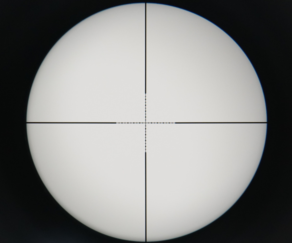 Прицельная марка Half Mil-Dot располагается в фокальной плоскости окуляра (на 2-м плане) и не меняет размеров при перемене кратности. Выполненная методом гравировки, остаётся тонкой и хорошо различимой даже без подсветки. От классической МилДот отличается дополнительной разметкой с шагом в полмила (0,5 mil). Наличие подсветки упрощает прицеливание в сумерках или на тёмном фоне. Регулировочный барабанчик находится на окуляре, батарейный отсек (уже с батарейкой) защищён герметизирующей уплотняющей прокладкой. Яркость меняется последовательно от 1 (бледный красный) до 11 (ярко-красный). Барабанчики выверки — стандартной высоты и конструкции, спрятаны под навинчивающимися крышечками. Благодаря размерам и внешнему резиновому кольцу крышечки легко снимаются как влажными пальцами (стрельба в дождь или жару), так и рукой в перчатке. Клики такие чёткие и громкие, что вносить поправки можно на слух (по счёту кликов). Для сброса настроек на новый «нуль» потребуется ослабить по 2 винта в крышке маховика.