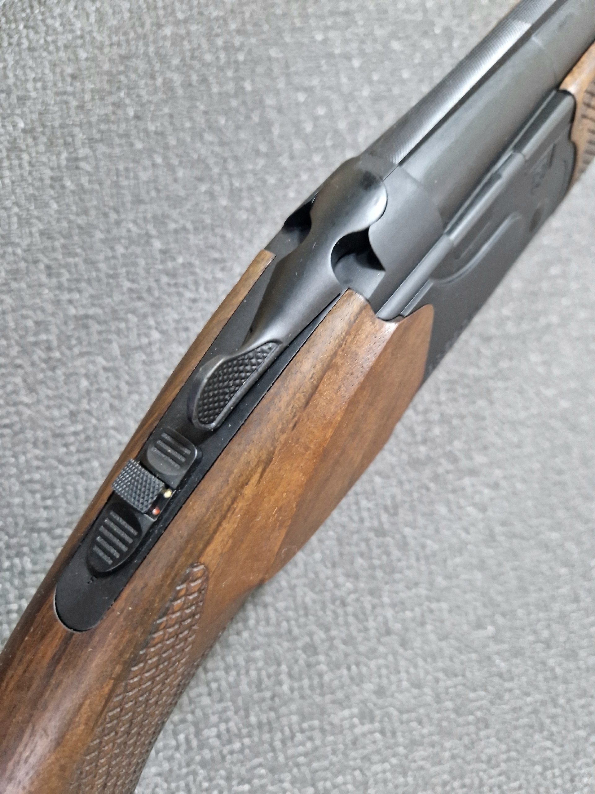 Предохранитель совмещен с селекторным переключением стволов. Эргономичные приклад и цевье выполнены из текстурированного ореха. Интересной особенностью является комбинированная конструкция затыльника – резина и пластик, что смягчает отдачу и повышает устойчивость ружья при прицеливании «навскидку». Также более точному прицеливанию способствует уменьшенная высота ствольной коробки.