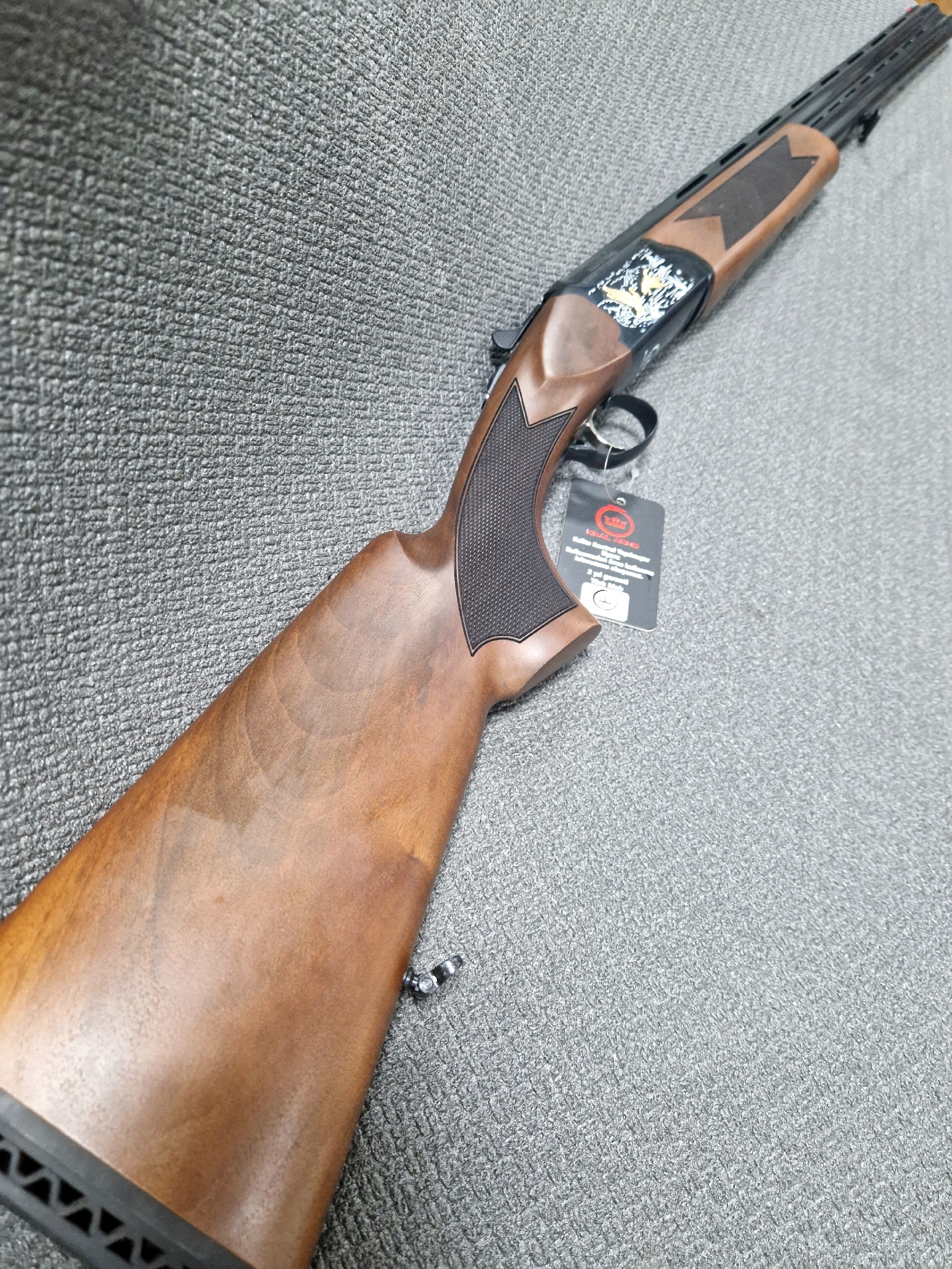 Элегантная двустволка с вертикальным блоком стволов от турецкой компании Kral Arms. Длина стволов 710 мм, есть сменные дульные насадки. Ствольная коробка из высокопрочного алюминиевого сплава усиленная стальной пластиной, есть гравировка и накладные элементы в виде золотых уток.